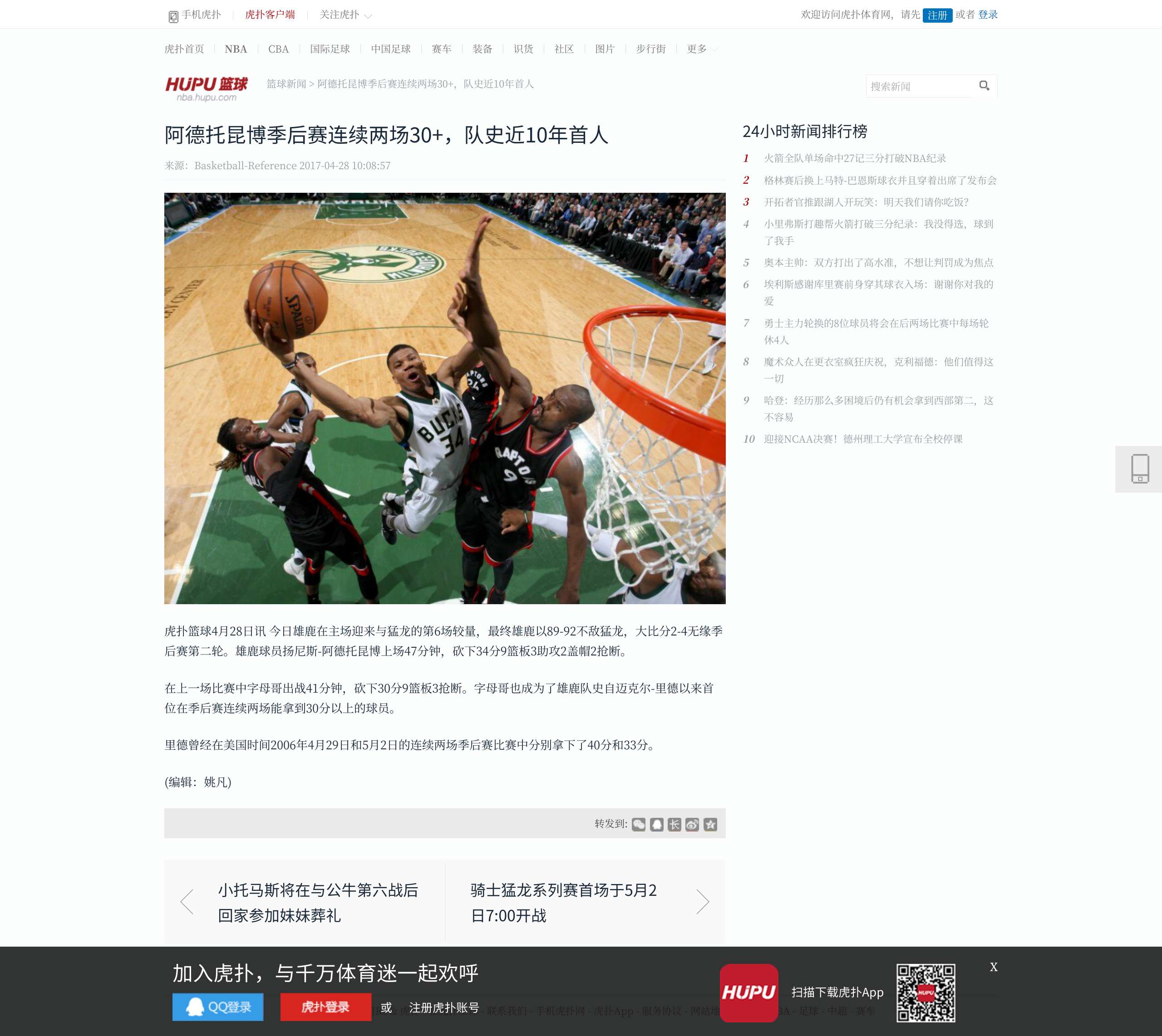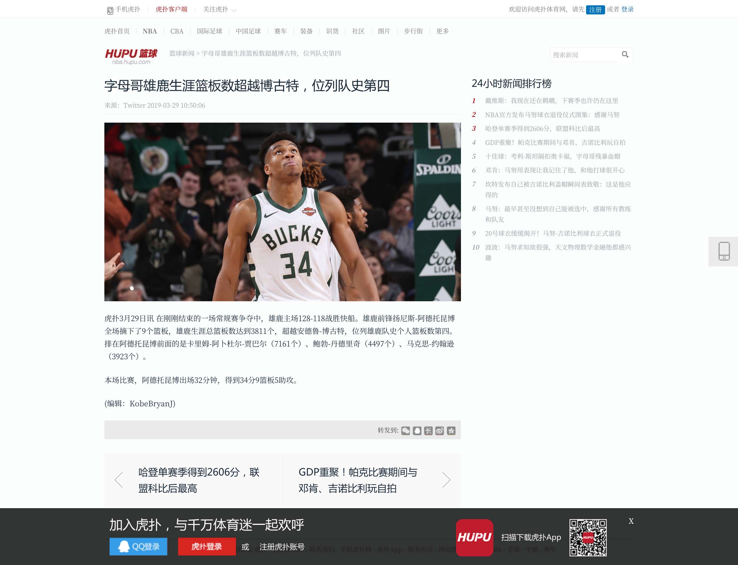 [流言板]字母哥拿到生涯第127次30+10+5,追平詹姆斯并列历史第四.虎扑.2024-04-09